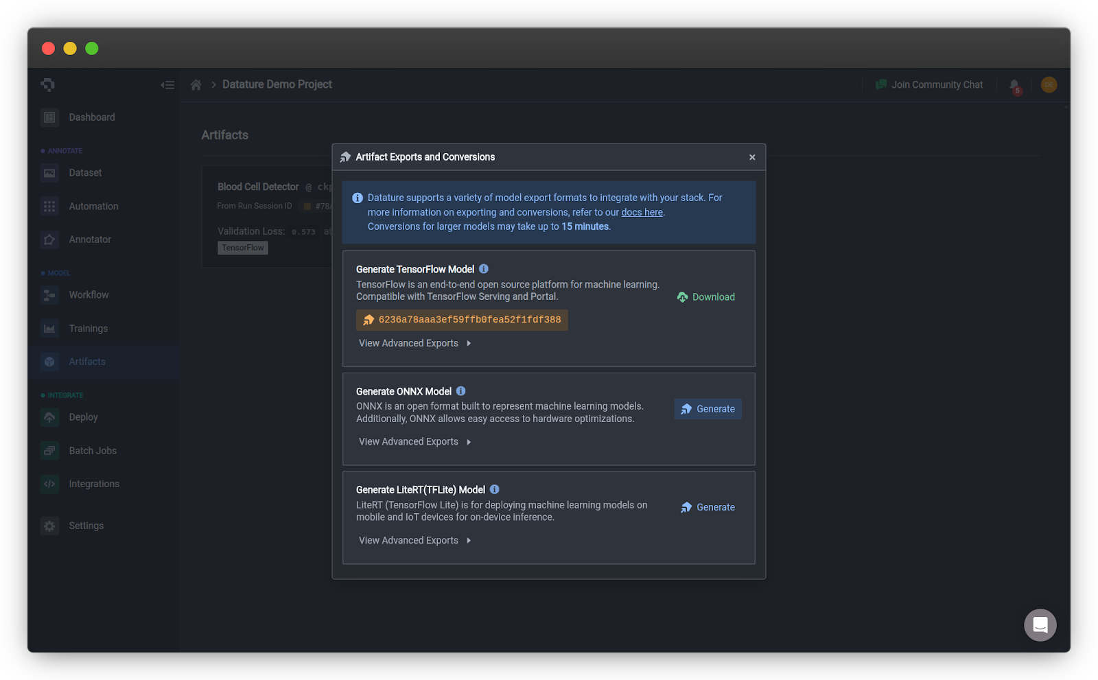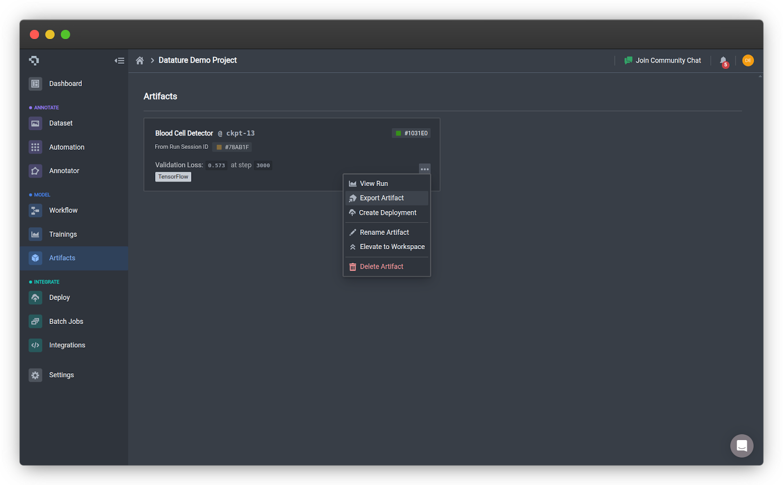 - Click Export Artifact on your trained model