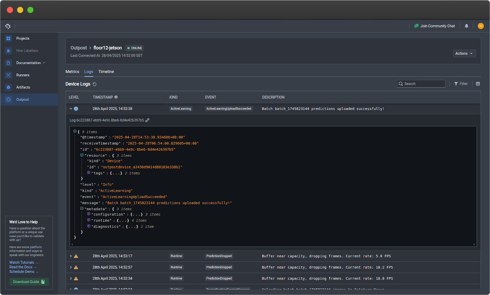 Once you have Outpost running, monitor performance on your device for 24-48 hours to establish a baseline, then optimize your configuration based on real-world data. Set up alerts for critical events and scale your deployment to additional devices as needed. For advanced integrations and API access, check out our developer documentation.