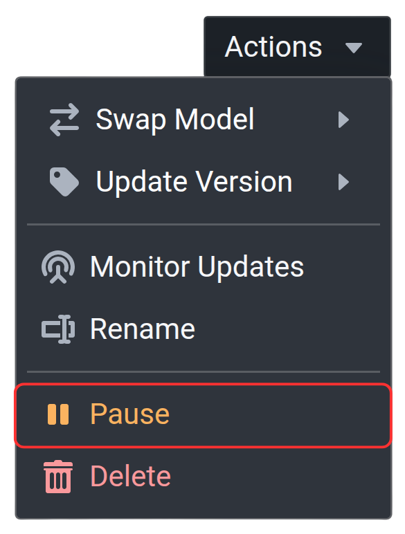 The pause and resume functionality can also be directly executed via your Outpost device card on Nexus, by selecting the corresponding buttons when clicking on the three dots.