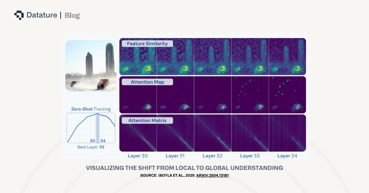 Here, we visualize local and global understanding (Boyla et al., 2025: arXiv:2504.13181). Focusing on the token marked by the pink star (the right car in the original picture), we see that in the layer prior to layer 32, attention is more localized to the selected car and the other car, demonstrating local understanding of the concept of a “car”. However, in layer 32 and beyond, we can see that other tokens, global tokens, become highly attended to. These tokens will generally encode global information related to the local features and are useful for downstream tasks.