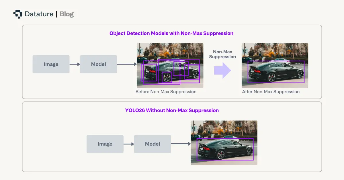 Traditional object detection models rely on Non-Maximum Suppression (NMS) as a post-processing step to filter duplicate predictions. While effective, NMS adds latency and requires manual threshold tuning which complicates deployment pipelines. For latency-sensitive applications like autonomous vehicles or robotics, even milliseconds of post-processing delay can have significant operational impact.