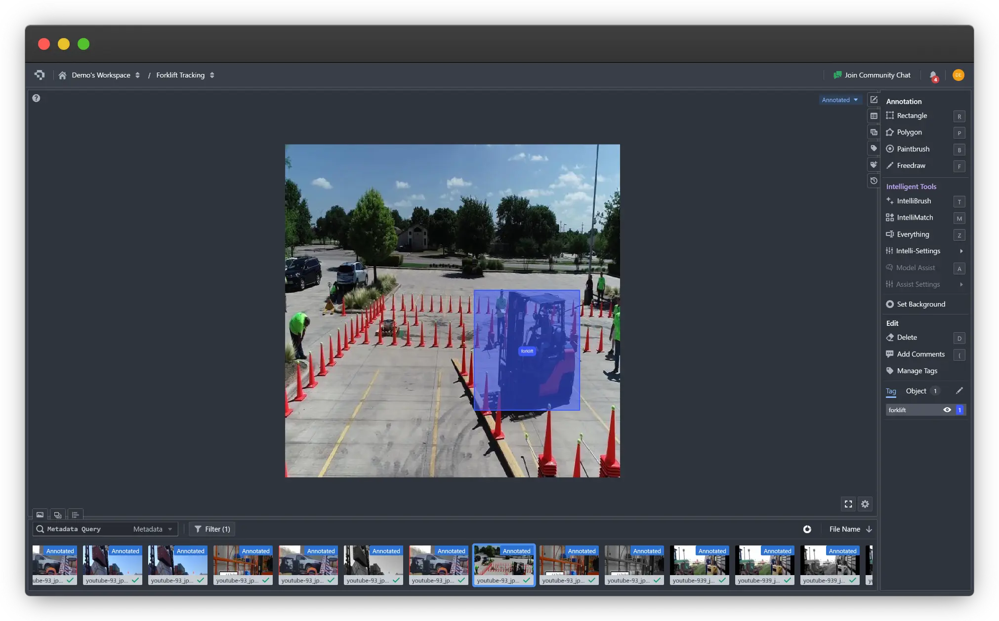 If you prefer annotating on platform, you can utilize the Rectangle tool or the range of intelligent tools to annotate bounding boxes for the forklifts in the images.