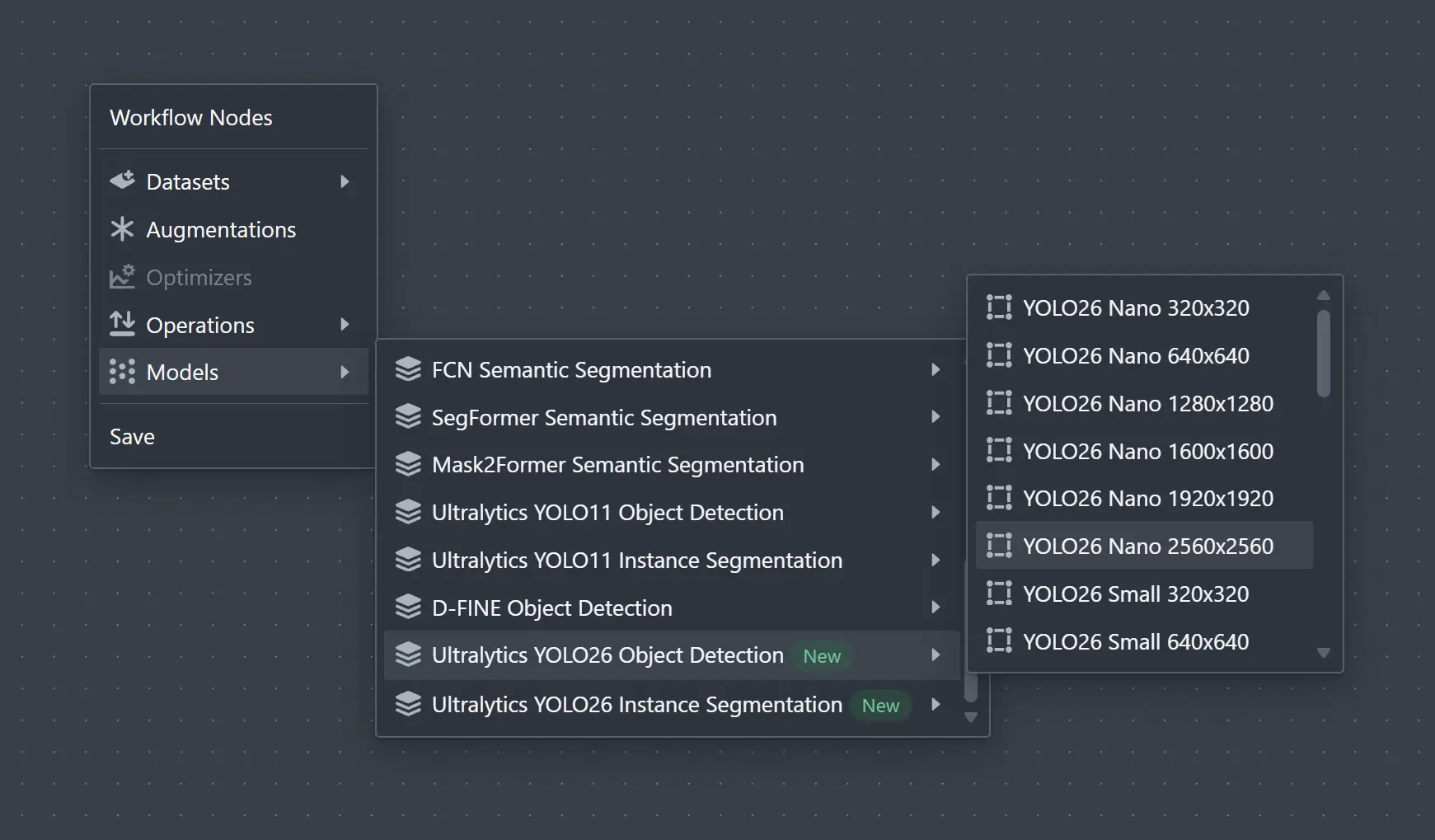 Once you’re happy with the dataset, you can go to the Workflow page to create your own custom workflow. To work with YOLO26, you can right click on the canvas, and you will see the options below.