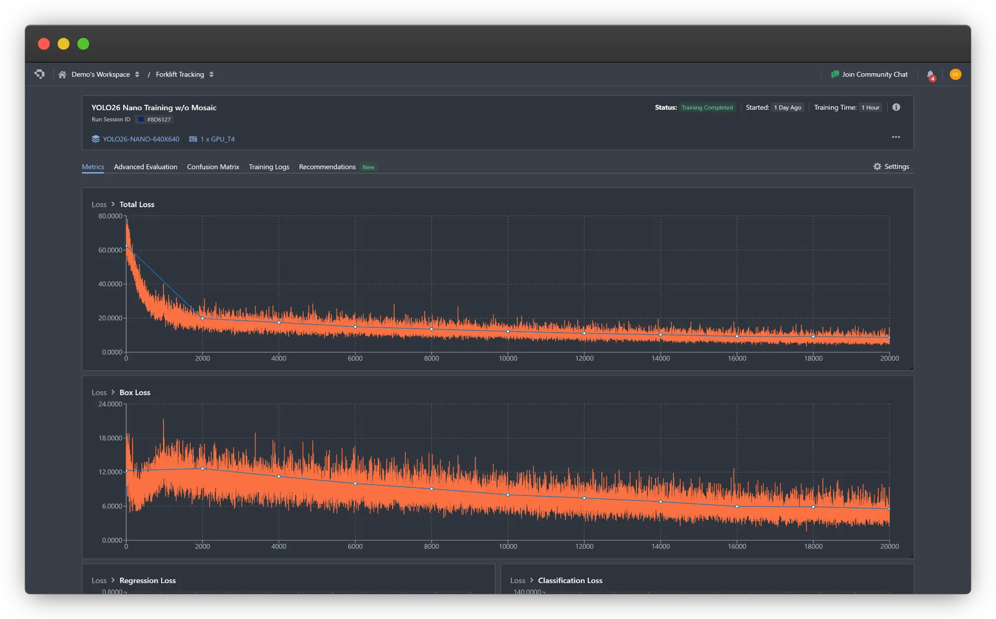 While the training is ongoing and after it is complete, you’ll be able to monitor the training dashboard on the Trainings page. The first page shows the general training metrics to help understand quantitative aspects. For guidance on reading these charts effectively, see our article on how to interpret training graphs.