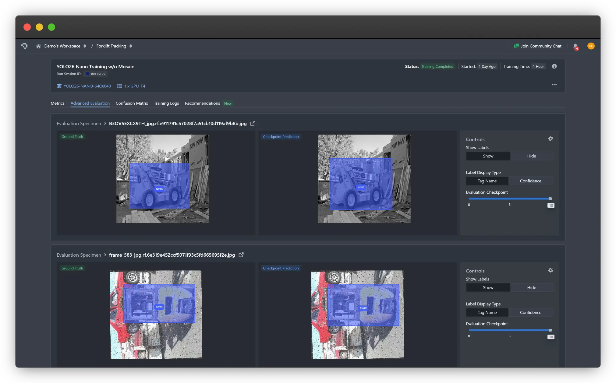 We also provide an Advanced Evaluation page to provide visual, qualitative checks on the quality of the model training as it progresses.