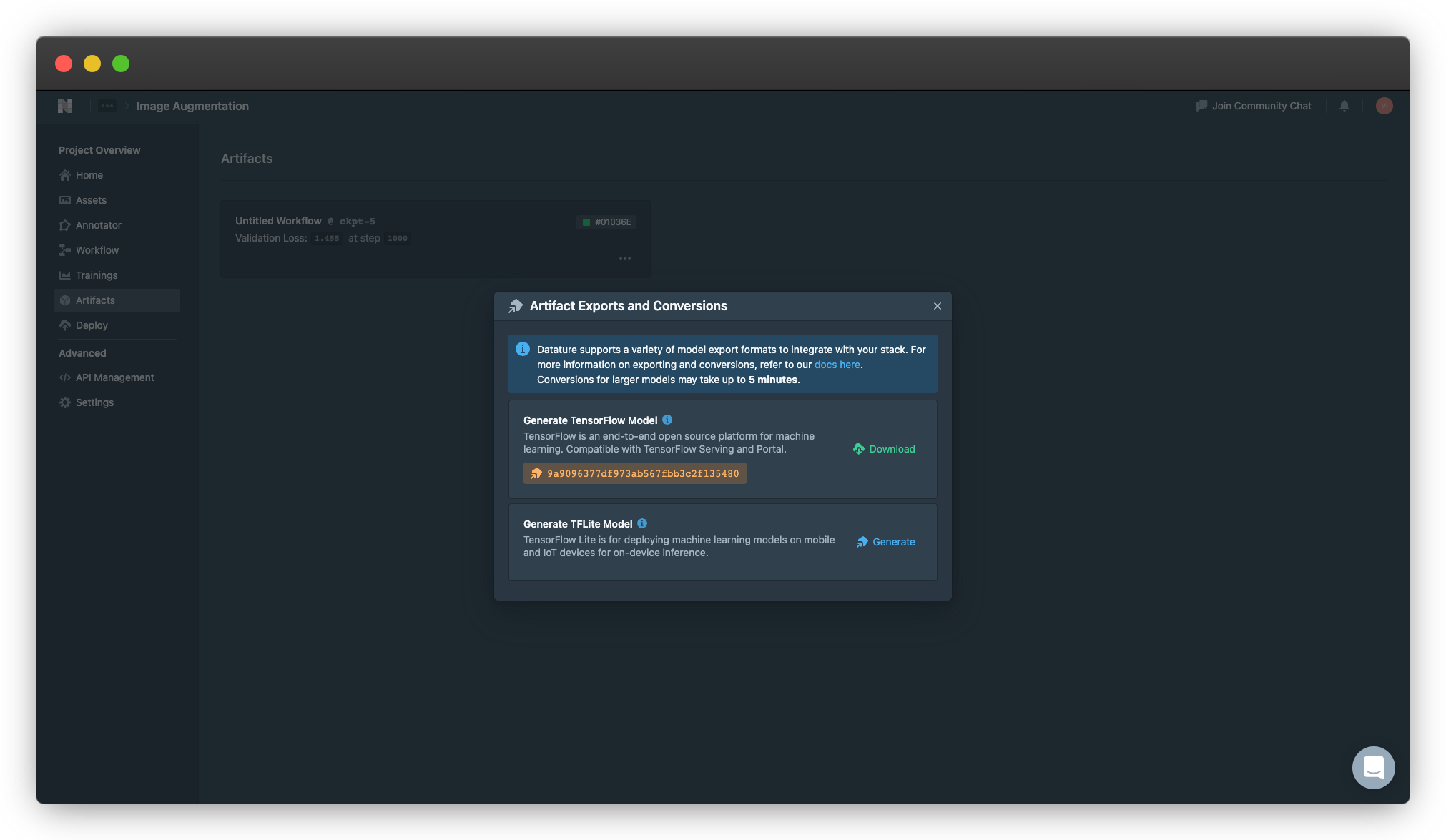 The final part of the training process is to export the trained model so that you can use it in your TensorFlow project. In the project overview page, select Artifacts and click on the … button and select Export Artifact: